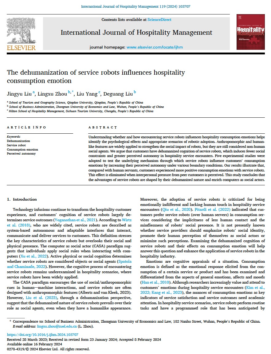 近日,旅游与地理科学学院刘晶瑜博士在International Journal of Hospitality Management上发表“The dehumanization of service robots influences hospitality consumption emotion”的研究成果。International Journal of Hospitality Management是JCR管理学一区、旅游与休闲管理一区期刊,最新影响因子为11.7。刘晶瑜博士是论文的第一作者,黑料不打烊