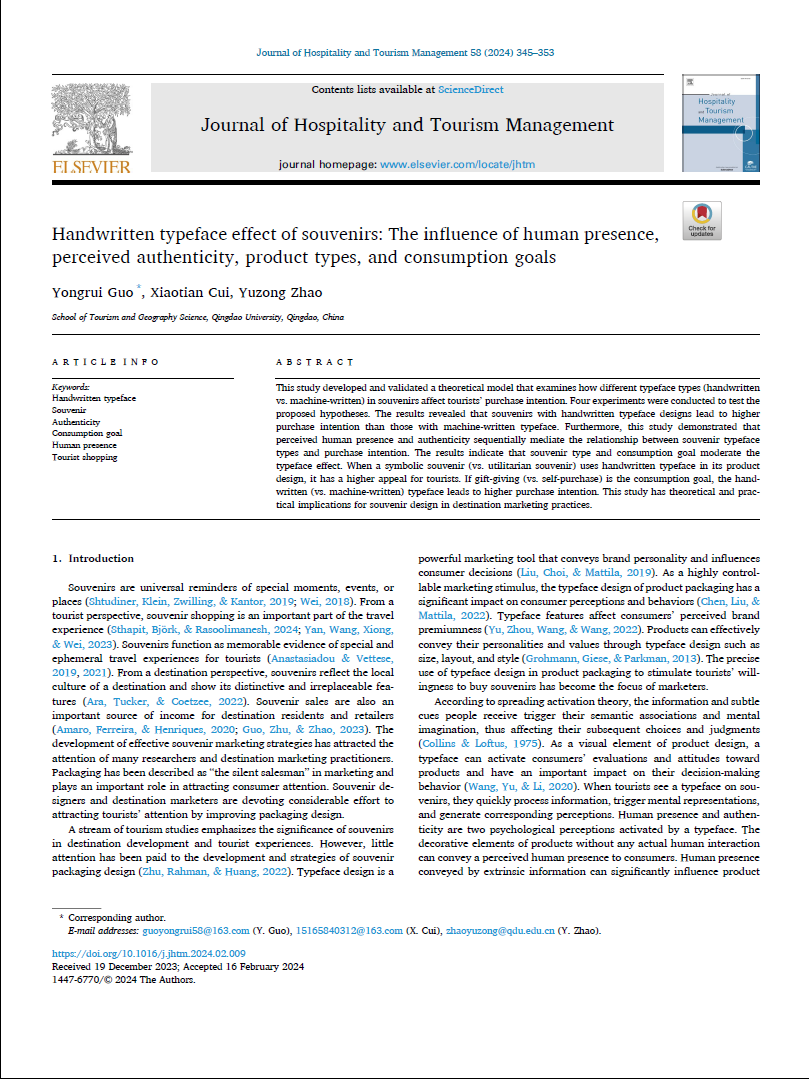 近日,旅游与地理科学学院郭永锐教授和赵玉宗教授团队在国际权威旅游期刊Journal of Hospitality and Tourism Management在线发表了题为“Handwritten typeface effect of souvenirs: The influence of human presence, perceived authenticity, product types, and consumption goals”的最新研究成果。Journal of Hospitality and Tourism Management最新影响因子为8.3,JCR旅游类和管理类一区权威期刊。郭永锐教授为论文的第一作者和通讯作者。黑料不打烊