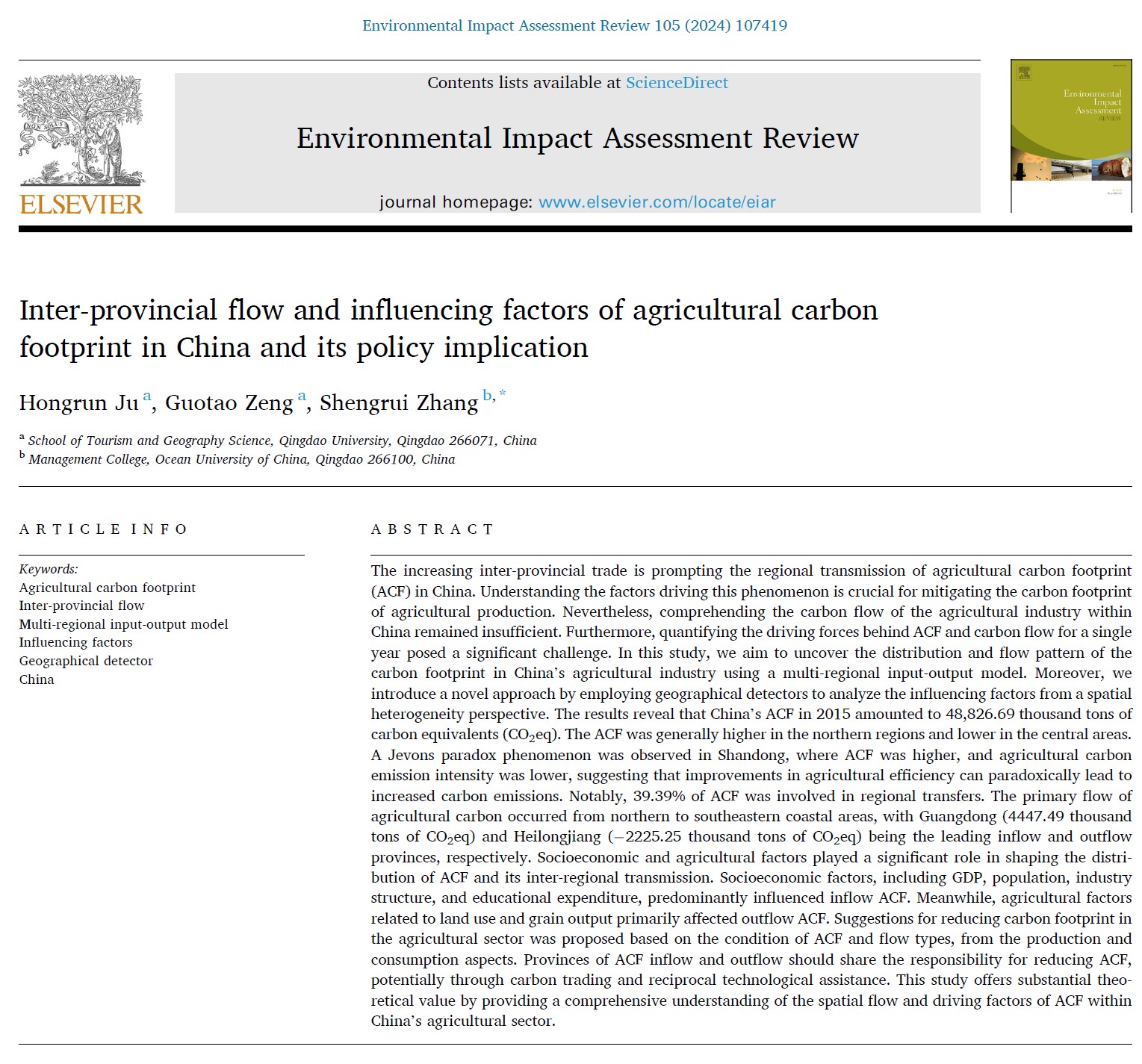 Ju, H., Zeng, G., & Zhang, S. (2024). Inter-provincial flow and influencing factors of agricultural carbon footprint in China and its policy implication. Environmental Impact Assessment Review. 105: 107419.