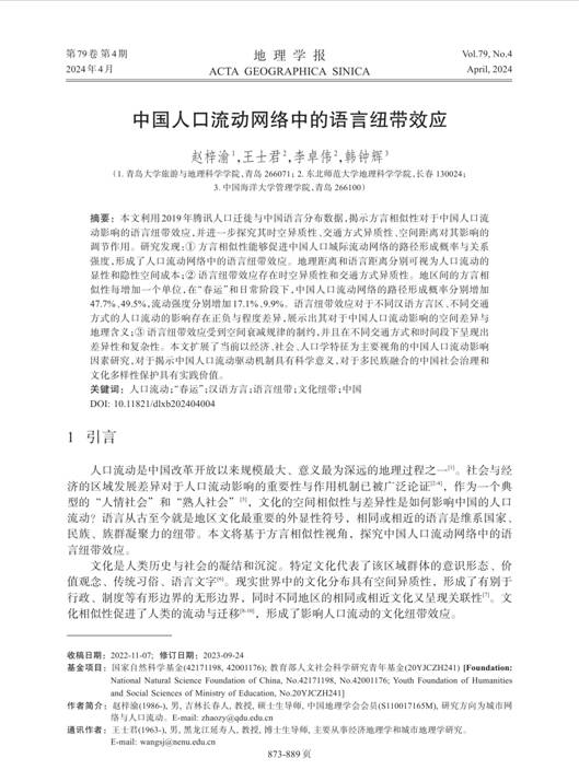 论文引用:赵梓渝,王士君,李卓伟,等.中国人口流动网络中的语言纽带效应[J].地理学报,2024,79(04):873-889.