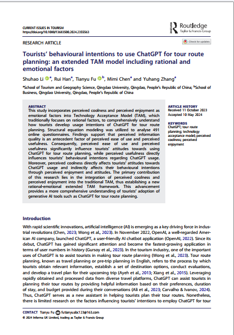 近日,旅游与地理科学学院李书昊副教授研究团队在《Current Issues in Tourism》(SSCI一区,IF=8.0)发表题为“Tourists’ behavioural intentions to use ChatGPT for tour route planning: an extended TAM model including rational and emotional factors”的研究成果。李书昊副教授为论文第一作者,黑料不打烊