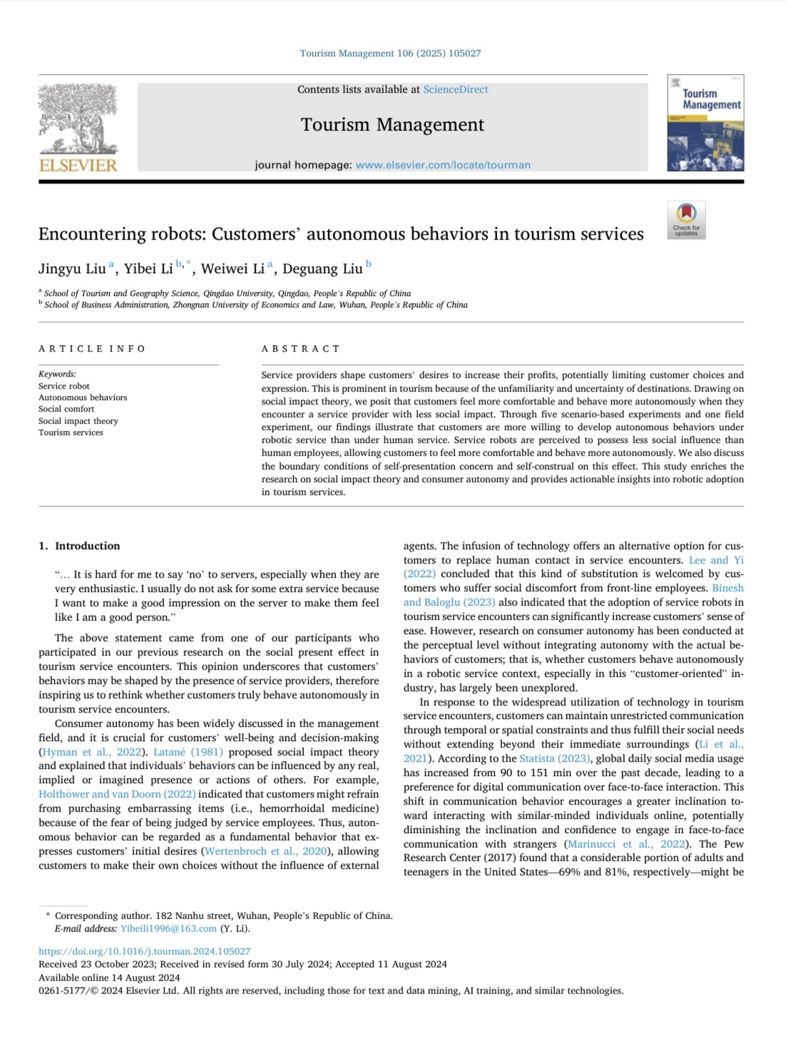 近日,学院刘晶瑜博士研究团队在旅游管理领域国际公认的三大顶级期刊之一《Tourism Management》(SSCI一区, ABS 4星期刊)发表题为“Encountering robots: Customers’ autonomous behaviors in tourism services”的研究成果。刘晶瑜博士为论文第一作者,黑料不打烊