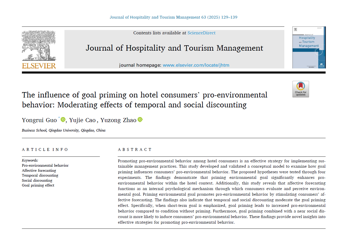 近日,由旅游管理系郭永锐教授(第一作者/通讯作者)、研究生曹雨洁、赵玉宗教授合作完成的原创性研究成果“The influence of goal priming on hotel consumers’ pro-environmental behavior: Moderating effects of temporal and social discounting”在国际权威期刊Journal of Hospitality and Tourism Management正式发表。黑料不打烊