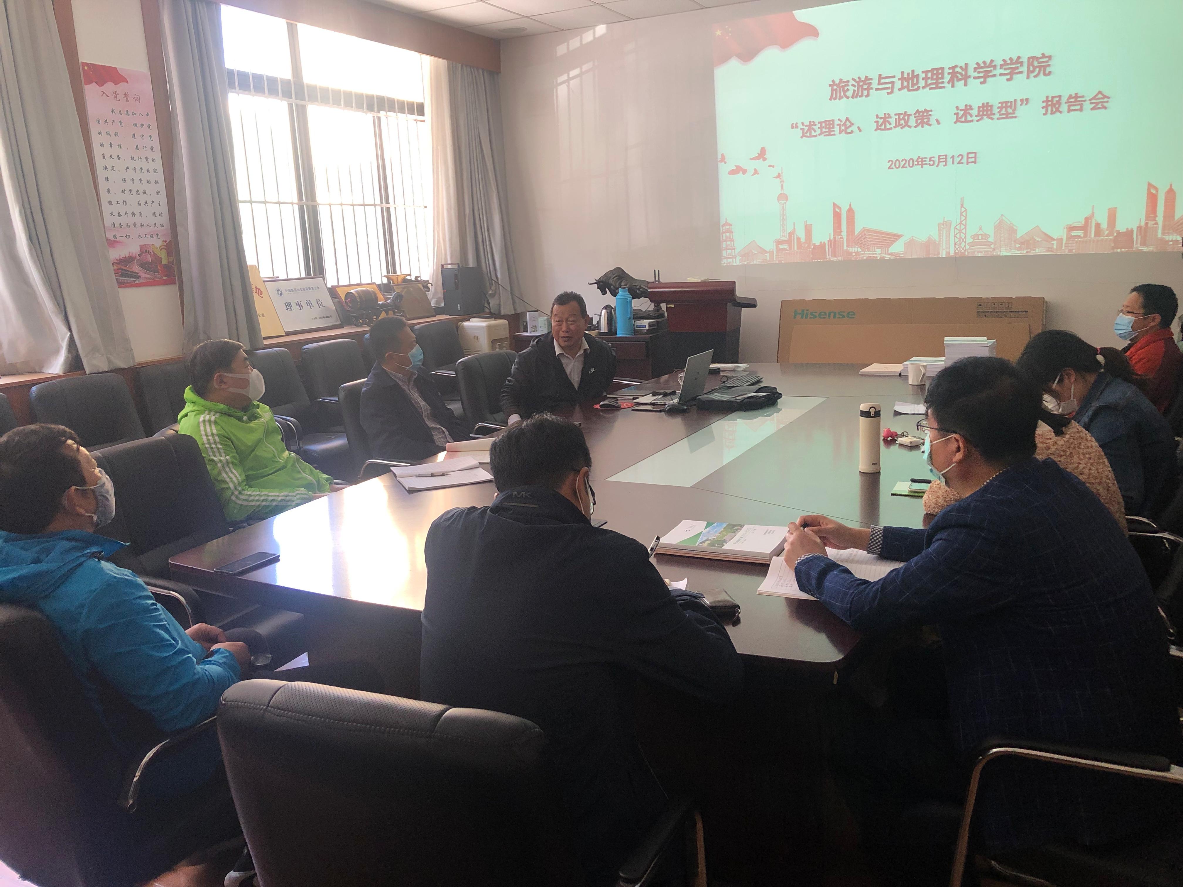 5月12日下午,旅游与地理科学学院在睿思楼122会议室举行“述理论、述政策、述典型”报告会,院党政领导和支部书记参加。报告会由院党委书记刘善东主持。