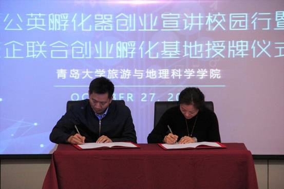 浮山校区图书馆报告厅举行。蒲公英(青岛)孵化器总经理杨荣辉,蒲公英(青岛)孵化器创业导师、华纳时代(北京)资本管理有限公司合伙人、创投基金总经理兼山东分公司总经理姜克,蒲公英(青岛)孵化器创业导师、橙子TC创始人、青岛真橙网络科技有限公司总经理王钦文,旅游与地理科学学院副院长张言庆出席了本次授牌仪式。旅游与地理科学学院部分同学参加了本次活动。