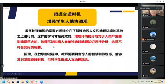 朱老师结合案例从借助典型的情境设置,培养学生的综合思维,如埃及的长绒棉,分成许多小元素,然后整合,从埃及到我国新疆,还有哪些地方?不断改进课堂教学方式,提升学生的地理实践力(如用地理模型,地理运动动画微视频);把握合适的时机,增强学生人地协调观,如日本大地震后对地震后重建家园的思考;结合读图识图能力的训练,培养学生的区域认知(如春风不度玉门关等),实效性强,对核心素养在地理教学如何培养很好的启示。