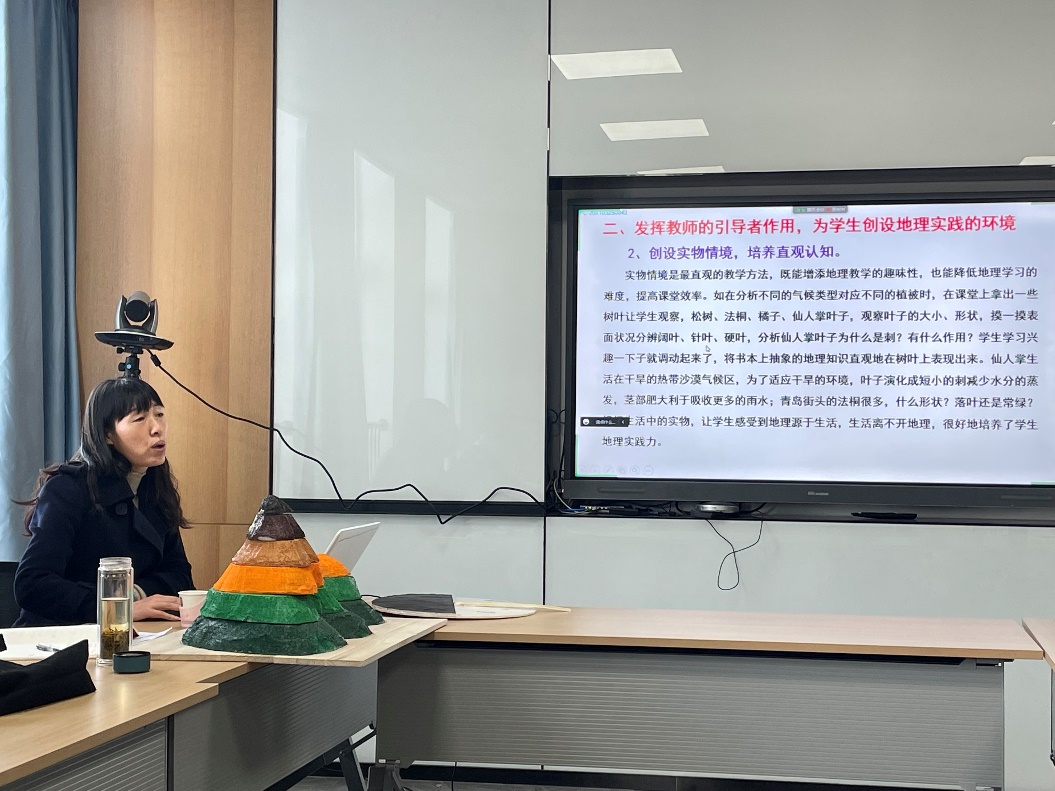 王芳老师是青岛市即墨区新兴中学高级教师,教学成绩突出,曾获青岛市优秀青年教师、青岛市初中地理学科带头人等称号,多次出示公开课,深受学生喜爱。王芳老师从课堂教学内容设计的微观视角入手,到如何发挥教师的引导作用,再到如何让地理教学方式多样化,最后指出构建学科知识体系的重要性,环环相扣,既说明了当下地理教学联系生活的重要性,又提出对地理教学基本逻辑的要求。王芳老师强调教师应注重启发学生智慧,让学生从学会到会学,培养学生自主学习的能力,促进学生终身发展,让研究生深入了解和把握中学地理课堂教学情境。