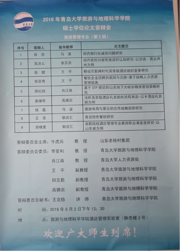 2016年旅游与地理科学学院硕士学位论文答辩会安排
