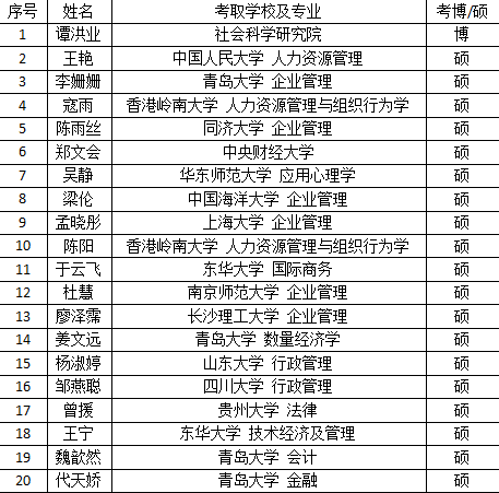 梁伦,人力资源管理专业二班,录取院校:中国海洋大学 ;录取专业:企业管理 ;座右铭:天道酬勤,勤能补拙。