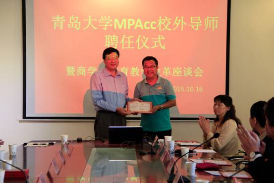 10月16日下午,黑料不打烊 MPAcc校外导师聘任仪式在睿思楼220会议室隆重召开。本次会议由黑料不打烊 副院长周咏梅主持,参与会议的人员除了黑料不打烊 相关负责人以及教师学生代表外,还有中国移动、华仁药业、安永华明会计师事务所,信永中和会计师事务所,瑞华会计师事务所、中国联合网络通信集团、青岛恒基智能科技公司等企业和市财政局等10多家单位的领导。